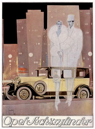 Speziell für diese Nobelwagen ließ Opel vom Maler, Graphiker u. Illustrator Prof. Hanns Pellar (1886-1972), einem der Lieblinge der damaligen feinen Gesellschaft, 1927/28 eine Reihe wunderschöner Werbegraphiken entwickeln.