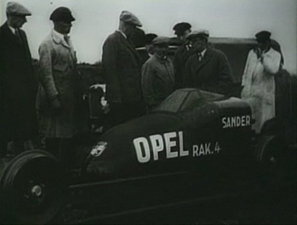 Der also von Volkhart gesteuerte Opel 4PS-Wagen legte mit den beiden Raketen, die zusammen einen Schub von 100 Kilogramm erzeugten, aber nur eine Strecke von 150 Meter zurück. Die Fahrt dauerte 35 Sekunden - das war ja kaum mehr als Dampfwalzentempo! Das Gewicht des Autos samt Fahrer von knapp 600 Kilogramm war einfach zu schwer. Und dann stellte sich auch noch heraus, daß die Handbremse nicht völlig gelöst war! - Es heißt, die Beteiligten hätten nicht gewußt, ob sie Lachen oder Weinen sollten ... Der Fritz sparte jedenfalls nicht mit beißenden Kommentaren, was Sander, um seinen guten Ruf fürchtend, derart in Rage brachte, daß er eine seiner stärksten Raketen an einem massiven Holzbalken befestigte und diese dann aus einem schnell als Startrampe senkrecht verbuddelten Abflußrohr auf über 2000 m Höhe gen Himmel jagte. Der Schrecken der davon völlig Überraschten war nachhaltig - Aber überzeugend!