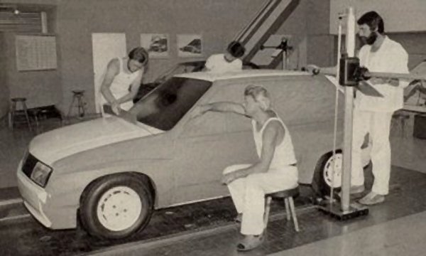 Blick in die Design-Abteilung mit dem Spider-Prototyp, der März 1982 in Genf präsentiert wurde. - Nach und nach entstanden so in Rüsselsheim immer mehr fertigungsreife Bauteile, aber erst im Mai 1982 konnten daraus in Saragossa 20 „Pilot“-Corsa gebaut werden. Diese Gelegenheit nutzte man: Am 13. Mai wurde das hochmoderne GM-Montagewerk vom spanischen König Juan Carlos I. feierlich eröffnet und Ferdinand Beickler, frischgebackener Chef der Adam Opel AG, fuhr den ersten Corsa aus der Montagehalle heraus! Die 20 „Pilot“-Corsa dienten zunächst der Erprobung und Abstimmung der Montageabläufe in Saragossa.