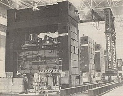 Schon Ende 1980 / Anfang 1981 konnte in mehreren Bereichen mit der Ausrüstung des Werks begonnen werden. Hier werden im April 1981 die Pressen für die Karrosseriebleche angeliefert. Darunter war eine von der Firma Weingarten hergestellte 2500-Tonnen-Presse, 14m breit und 730 Tonnen schwer - zum damaligen Zeitpunkt die größte der Welt! Wenig später kamen die Schweißroboter und bald nach der Inbetriebnahme des werkseigenen Kraftwerkes (Stromerzeugung aus Erdgas) konnten die Tests und Probeläufe beginnen.