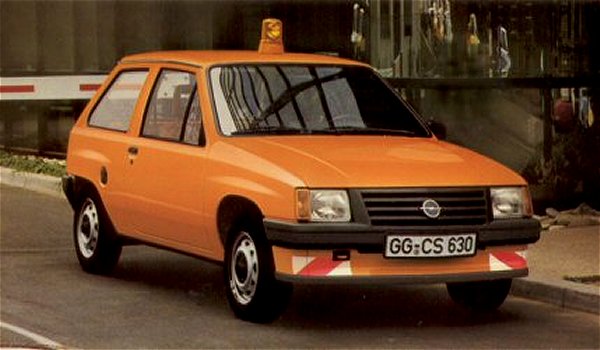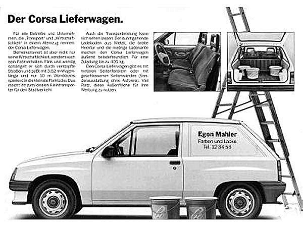 1983 wurde das Corsa-Angebot auch mit ausgesprochen Nützlichem bereichert. Bereits ab 07/1983 als Fahrschulwagen angeboten, wurde der Corsa mit einem breiten Angebot an möglichem Sonderzubehör ab 09/1983 in das Angebot von Kommunalfahrzeugen aufgenommen, .. Ab 10/1983 gab es ihn dann für viele gewerbliche Zwecke als ungemein fixen und beweglichen Kleinlieferwagen, der immerhin 405 kg Nutzlast befördern konnte. Angeboten wurde er mit und ohne hintere Seitenfenster - zum gleichen Preis!