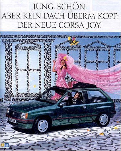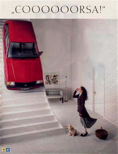 Frauchens kleiner Liebling - viele Opel-Werbungen zeichnen sich durch einen gehörigen Schuss hintergründigen Humors aus! Aber, in der Tat: der Corsa ist ein Liebling der Frauen. Zu Zeiten wurden 60 Prozent aller Corsa von Frauen im Alter bis ca. 30 Jahre gekauft!