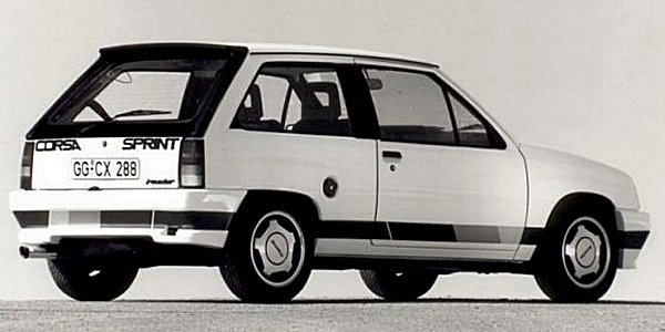Für die meisten Messebesucher sicher noch faszinierender als der unerwartet entdeckte Rasierapparat war die in Zusammenarbeit mit Irmscher nach Gruppe B-Reglement aufgebaute Studie „Sprint“. Damit sollte das Potential des Corsa für den Motorsport demonstriert werden. Rallye-Atmosphäre pur: Aluminium-Überrollkäfig, Hitzeisolierung aus Alu-Folie, Leichtbau-Armaturenbrett aus Alu, auf dem die Instrumente mit Schnellverschlüssen montiert waren. In Sekunden auszuwechseln. Hinter den Leichtbau-Sportsitzen war ein 80-Liter-Kraftstofftank montiert, auf dem in 2 entsprechend geformten Ablagen die Helme abgelegt werden konnten. Das Opel Design-Center hatte sich also einiges einfallen lassen, um die Bedingungen für die Piloten zu optimieren!
