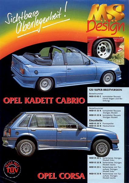 Als mögliche Ausstattungen standen nun im Angebot: • Swing; hier ein 1.4i. Weil Fotos der Viertürer eher selten sind, hier noch einmal als Tuningangebot von MS-Design zusammen mit dem Kadett E Cabrio.• City • Joy, für den wie zuvor für den Swing, ein Sportpaket erhältlich war. • GSi