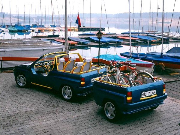 Auf der IAA gab es auch einen ganz besonderen Corsa-Umbau zu bestaunen: den Topino von Michalak! Ein witziges, sehr sympathisches Sommer- oder Freizeitvehikel im Buggy-Stil. Laut Bernd Michalak war gar nicht an eine etwaige Serienfertigung gedacht worden. Man habe den Topino entworfen und gebaut, weil es Spaß gemacht habe, „mal zu schauen, was so möglich ist“. Der aus einem Corsa-Hinterwagen entstandene offene Anhänger gehörte fest dazu. Der Topino blieb dann auch ein Einzelstück. Für Presseaufnahmen verfrachtete man ihn auf eine der spanischen Ferieninseln, wo er dann gleich blieb. Vor einigen Jahren hat ihn ein Liebhaber zurück nach hier geholt und gründlich saniert.