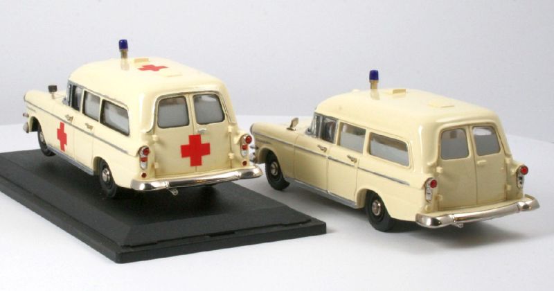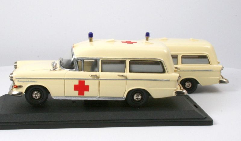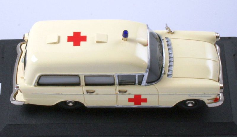 Habe mal ein wenig "nachgeforscht", im Opel Jahrbuch 2005, auf Seite 51. ist ein Opel Kapitän A Krankenwagen abgebildet, bei diesen gibts die roten Kreuze, nur vorn und hinten auf dem kleinen runden "Beleuchtungssignal" am Dach.