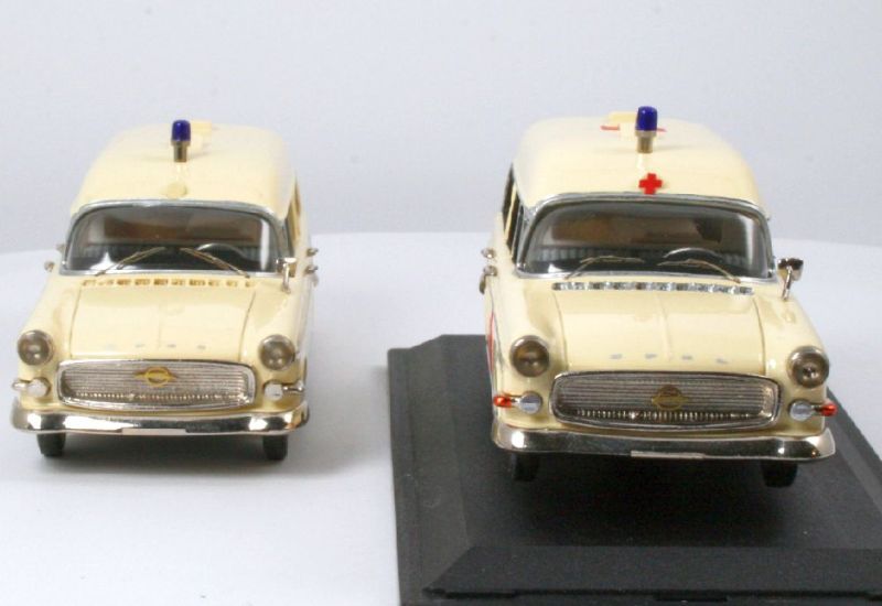 Habe mal ein wenig "nachgeforscht", im Opel Jahrbuch 2005, auf Seite 51. ist ein Opel Kapitän A Krankenwagen abgebildet, bei diesen gibts die roten Kreuze, nur vorn und hinten auf dem kleinen runden "Beleuchtungssignal" am Dach.