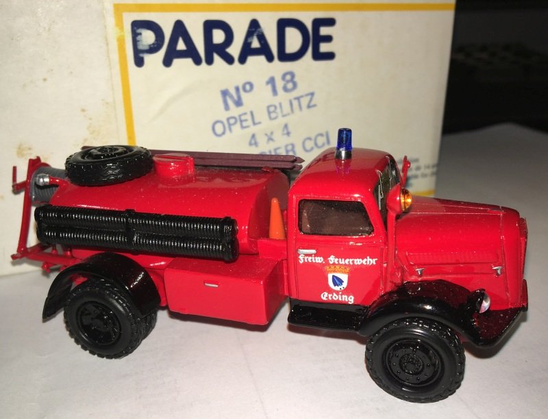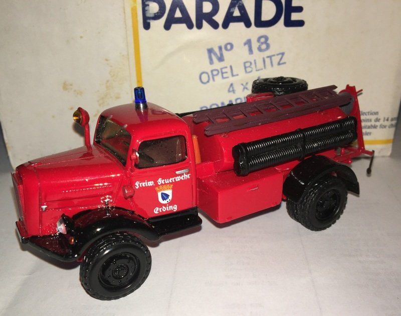 Modell / Kurzbeschreibung: Opel Blitz 4x4 Feuerwehr Wagen - BJ ca. 1939–1945 - 1:50 - Parade No.18 - rot - Fertigmodell