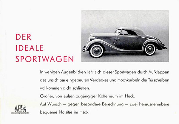Ende 1938 ersetzte der Kapitän im Opel-Angebot den überaus erfolgreichen Super 6. Von diesem übernahm er den glänzend gelungenen Sechszylinder-OHV-Motor mit 2,5-Litern. Ansonsten aber war der Kapitän eine völlige Neuentwicklung, deren überaus modern anmutende Stromöinienkarosserie mit den characteristischen achteckigen Scheinwerfergläsern im Windkanal entwickelt worden war. Seinen ersten ganz großen Auftritt hatte er auf der IAMA in Berlin im Februar 1939. Das ab Werk angebotene 2-Türen/4-Sitzer Cabrio ergänzte Gläser um eine noch schnittigere 2/2-sitzige Ausführung. Hier Abbildungen aus dem Verkaufsprospekt.