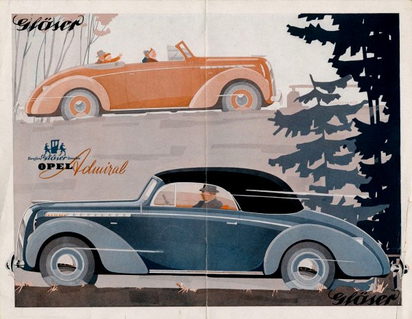 Gläser war mit einem prächtigen 2/4-sitzigen Cabriolet vertreten. Entsprechend hochgestimmt äüßerte sich die zeitgenössische Fachpresse: „Der deutsche Karosseriebauer hat sich einen internationalen Ruf geschaffen. Unser Bild zeigt ein wunderbares Kabriolett von Gläser auf Opel Admiral. Das Verdeck verschwindet vollkommen und hat vollautomatische Betätigung.“ (Damit machen noch heute manche Reklame, als hätten sie's soeben erfunden...)