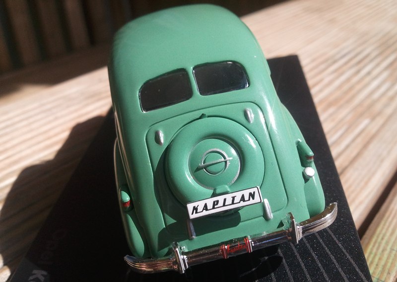 Abgesehen von der wirklich scheußlichen Farbe: Die vorderen Kotflügel sind zu breit, damit die 6-eckigen Scheinwerfer erst recht. Die Wischer waren beim Original gegenläufig, die Reserveradabdeckung nicht aufgesetzt, sondern Teil des Kofferdeckels. Die Räder sind zu klein und die Spur zu breit. Etwas störend ist auch das Spaltmaß bei den hinteren Kotflügeln....