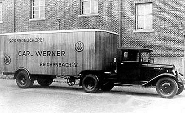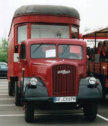 Wie oben bereits erwähnt, gab es Omnibus-Auflieger bereits in Kombination mit dem Blitz 2½-Tonner aus den Jahren 1934-1937. Zunächst aber ein Ausschnitt aus einem Prospekt des 2- / 2½-Tonners von 1935, in dem die Ausführung als Sattelzug bei den möglichen Aufbauvarianten gezeigt wird Der große Vorteil neben dem Gewinn an Ladevolumen war, dass sich die mögliche Nutzlast gegenüber einem Pritschenwagen praktisch verdoppelte. Hier eine Ausführung mit Kofferaufbau. Vor dem gleichen Hintergrund entstand das nächste Bild. Als Hersteller dieses (und des folgenden) Fahrzeugs wird wieder die Firma Schumann (Werdau / Sachsen) genannt. Das letzte Beispiel stammt dagegen mit größter Sicherheit von Kässbohrer. Der Ulmer Hersteller ließ seine Erzeugnisse traditionell vor dem Hauptportal des dortigen Münsters ablichten. TseHa