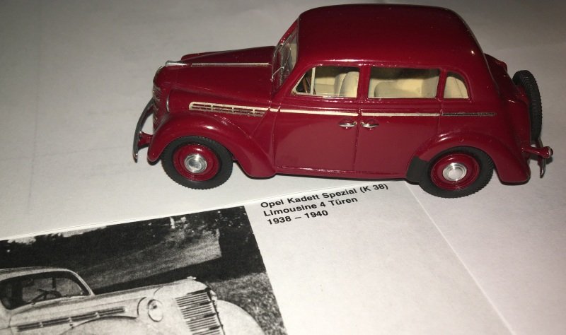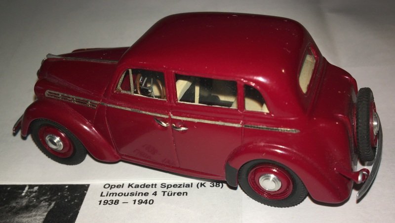 Modell / Kurzbeschreibung: Opel Kadett (K38) - Limousine 4-tür - BJ 1938-40 - 1:43 - EMC by J.Kiper - Resin weinrot - Fertigmodell