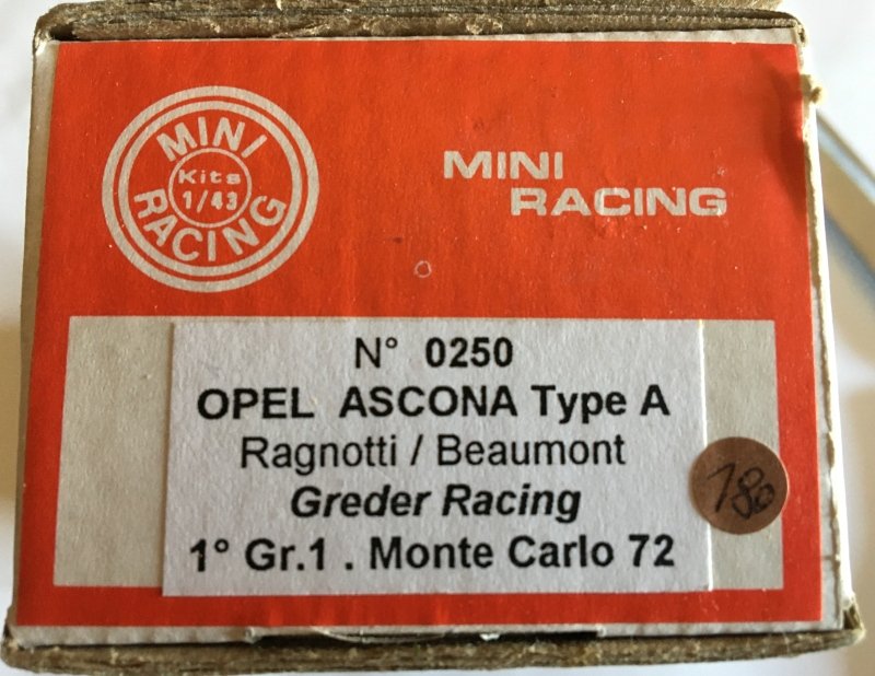 Modell / Kurzbeschreibung: Opel Ascona A - Limousine - BJ 1972 - 1:43 - Mini Racing 0250 - Resin weiß/rot - gebauter Bausatz