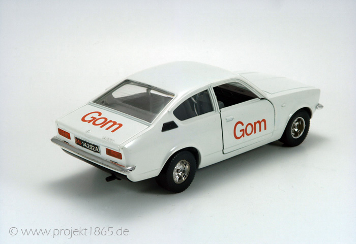 blaumet. mit Decals und gelben Felgen NEU grün mit Decals und gelben Felgen grün mit Decals und grauen Felgen weiss mit Decals und gelbe Felgen weiss mit Decals und graue Felgen weiss Werbemodell mit Aufdruck "Gom" auf Türen und Kofferdeckel NEU Rally mit großen Rädern Rally mit großen gelben Felgen Rally mit kleinen Rädern und ohne Dachdecal Rally mit zusätzlicher Werbung einer französischen Firma (original?)
