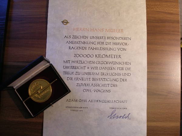 Und erfuhr das diese dem Fahrzeughalter bei erreichen der dementsprechenden Kilometeraufleistung seines Opel überreicht wurde, das durch dem Opel-Händler bestätigt werden konnte, daraufhin wurde das Stammwerk in Rüsselsheim gebeten diese Plaketten mit einer individuellen Urkunde (größer DIN A4, geprägt) an den Händler abzugeben, der diese dann an seinen Kunden (möglichst mit einer kleinen Feier“minute“) überreichen sollte, inklusive Miniaturnadel zum anstecken.