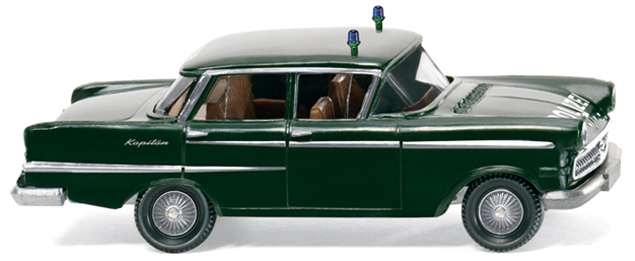 Karosserie in tannengrün, Inneneinrichtung in braun gehalten. Zwei blautransparente Stangenblaulichter im Dach eingesetzt. Kühlergrill in silber, Scheinwerfer per Handbemalung gesilbert. Seitliche Fensterzierleisten in silber. Vorn und hinten Schriftzug „Opel“ in silber, heckseitig Griff und Türschloss zusätzlich in silber. Kühlergrill vorn mit Schriftzug „Polizei“ in weiß. Heckseitiger Dachaufdruck „Polizei“ in weiß. Rückleuchten per Handbemalung in signalrot gestaltet. Felgen gesilbert. Lautsprecher in grün beifahrerseitig auf dem Kotflügel eingesetzt.