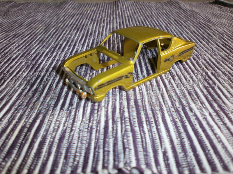 alter Kadett B Coupé - Kiemencoupé - in gold metallic, Lack gut, Zierstreifen unvollständig, hintere Stoßstange fehlt, vordere Einheit aus Kühlergrill/Stoßstange vorhanden, jedoch sind die Ecken abgebrochen und das Chrom "verwischt", leichte Verbiegung an der A-Säule/Dachholm links, geringer "Zinkfrass" an rechter Endspitze. Ebenso fehlen Verglasung - Türen - Motorhaube, .......