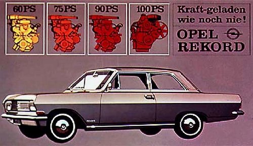 Gegenüber den Motoren mit 1,5 Liter / 55 PS, 1,7 Liter / 60 PS bzw. 1,7 Liter / 67 PS beim Rekord A war dies eine deutliche Leistungssteigerung! Opel schloss damit zur motorenmäßig hier und da etwas enteilten Konkurrenz auf. „Kraft-geladen wie noch nie“ lautete dem entsprechend auch ein Werbeslogan. Als Topmodell blieb die schon als Rekord A gelieferte 6-Zylinder-Version L-6 mit OHV-Motor (2605 cm³; 100 PS / 74 kW bei 4600 U/min) im Programm. ¹