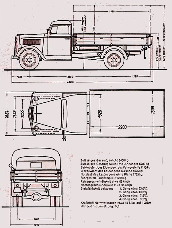 Die haben ein Vorbild aus den Jahren 1935 - 1938 "erwischt" - der Blitz 3t S wurde mit der hohen Militärpritsche ab Beginn der Serienfertigung in erheblichen Stückzahlen an die Wehrmacht geliefert: Als dann 1938 zum Bau des Westwalls aberhunderte Opel Blitz eingesetzt wurden, machte man ausgiebig Gebrauch von der Tatsache, dass es die Güte der Konstruktion des 3t S durchaus erlaubte, ihn schadlos mit gut 40% zu überladen - aus dem 3-Tonner wurde somit de facto ein 5-Tonner! Nur die Radstifte machte diese Überlastung nicht auf Dauer mit, weshalb man ihre Zahl von 6 auf 8 erhöhte.