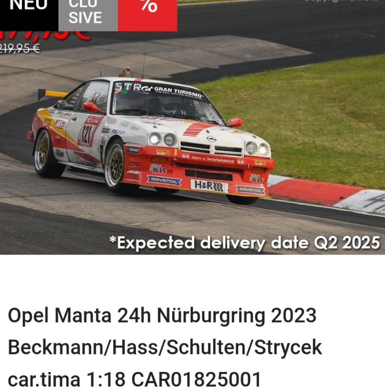 Alle Manta- und Nürburgring-24h-Fans aufgepasst! car.tima bringt den legendären Beckmann-Manta als Modell. Aktuell zum reduzierten Kurs vorbestellbar - mit und ohne Unterschrift - 50 Stück mit, 500 Stück ohne. Die Auslieferung soll laut Newsletter im Q2 2025 passieren: