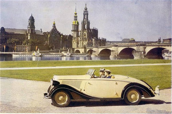 Der 2 Liter (1,9l-Sechszylinder mit 36 PS) entstand 1933 parallel zum und als größerer Bruder des Opel 1,3 Liter (1,3l-Vierzylinder mit 24 PS). Beide Modelle kamen im Januar 1934 in den Handel und zeigten neu entwickelte und optisch wesentlich ansprechendere Karosserien als ihre Vorgänger 1,2 / 1,8 Liter von 1931. Fahrwerkstechnisch waren sie weitestgehend identisch, was heißt: beide litten an dem „amerikanischen“ Fahrwerk, dass für deutsche Straßenverhältnisse allzu weich abgestimmt war. Den 1,3 Liter, zusätzlich an schwacher Motorisierung krankend, löste Opel bereits 1935 nach nur 29.002 gebauten Einheiten durch den revolutionären Olympia (1. deutsches Auto mit selbsttragender Ganzstahlkarosserie!) ab. Mit strafferer Federung blieb der 2 Liter bis 1937 im Programm, und mit einer Gesamtproduktion von 52.594 darf er denn dann doch als Erfolgsmodell in der gehobenen Mittelklasse gesehen werden. Von 08/1934 bis 12/1936 wurde der 2 Liter als Modell 20120 (intern) auch in 2.050 Exemplaren als Sechssitzer mit längerem Radstand gebaut. Hier in der ganz seltenen Bauform als Landaulet. Allerdings sind bei dieser Ausführung die Experten uneins, ob es von Gläser oder Hebmüller stammt. Ganz zweifelsfrei von Gläser sind die folgenden. Zunächst ein rassiger Roadster von 1935. Man beachte die Abdeckung der hinteren Räder! 2 Liter Sport-Zweisitzer. Anhand dieser herrlichen Farbaufnahme sei einmal darauf hingewiesen, dass die allermeisten Gläser-Werksaufnahmen am rechten Elbeufer gegenüber der wunderschönen historischen Dresdener Altstadt entstanden. Weitere Bilder zum 2 Liter Sport-Zweisitzer, den es (s.u.) in verschieden Varianten gab. Nicht völlig klar ist, ob Gläser auch die Karosserien für die legendären 2 Liter Geländesportwagen beisteuerte.