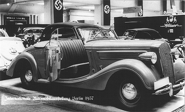 Bilder von der IAMA Berlin 1937: Das folgende Bild zeigt überdeutlich an, wie auch diese wichtige internationale Veranstaltung propagandistisch ausgeschlachtet wurde.. Super 6 2/3 Cabriolet 1937. Leider ist in dieser Heckansicht die Klappe des Schwiegermuttersitzes nicht sehr deutlich zu erkennen. Dafür umso schöner auf dieser Prospektabbildung!