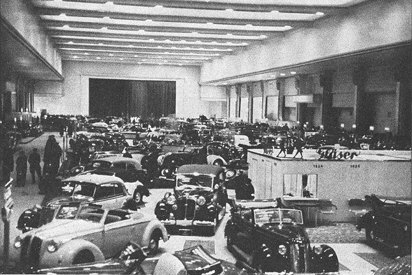 Internationale Automobil- und Motorrad- Ausstellung Berlin 1939 - Blick auf den Gläser-Stand. Ausdruck stolzen Selbstbewußtseins - der Gläser-Stand auf der IAMA nahm mehr Raum ein als der der meisten Autohersteller! Links vorne steht Opels Flaggschiff Admiral als hinreißendes 2/4-sitziges Cabriolet. Ein Prunkstück! Die würdige Gesellschaft bilden ein Audi 920 4-Fenster-Cabrio (rechts daneben), ein Wanderer W23 4-Fenster-Cabrio (hinter dem Admiral), davon rechts ein Horch 930 (oder 850/853?) fast in Frontansicht, und ein Steyr 220 Sport steht quer im Vordergrund.