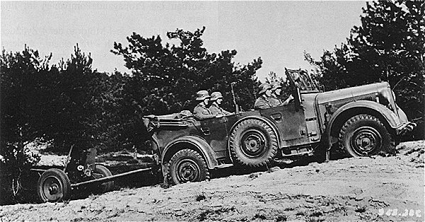 Im Gegensatz zum mittleren entpuppte sich der „Leichte geländegängige Einheits-Personenkraftwagen“ Kfz. 1, den Stöwer, BMW und Hanomag (in der Reihenfolge der gelieferten Stückzahlen) bauten, unter den Bedingungen des Kriegseinsatzes als empfindsames Weichei, das serienweise ausfiel. Um den nun sprunghaft gestiegenen Bedarf der Wehrmacht an kleinen, wendigen Führungs- fahrzeugen zu decken, wurden zahlreiche der abertausenden bei Kriegsbeginn „eingezogenen“ zivilen Pkws mehr oder weniger weitreichenden Umbauten unterzogen, die sie unter Verwendung von Bauteilen aus dem Einheits-Pkw-Programm zu provisorischen Kübelwagen machten. Dabei hatten die beteiligten Karosseriebaufirmen relativ freie Hand, so dass es trotz der vom Heereswaffenamt in Berlin hastig angefertigten Musterzeichnungen die vielfältigsten Spielarten dieser Fahrzeuge gab. Übrigens erwiesen sich diese Fahrzeuge oftmals als brauchbarer und langlebiger als manche militärische Spezialkonstruktion. Das Bild zeigt einen Opel Super 6, der es in Diensten einer Panzerdivision immerhin bis auf die Krim und in den Kriegssherbst 1943 hinein geschafft hat. Das Fahrzeug ist nicht nach- weislich ein Gläser-Umbau, aber sehr typisch für seine Art.
