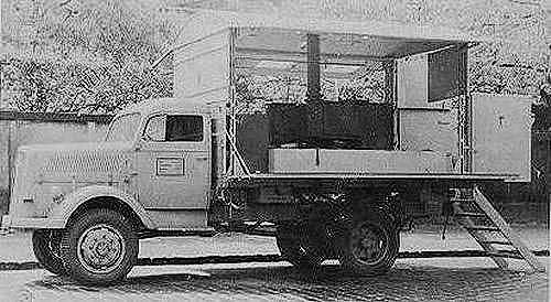 Außerdem wurden nun auch spezielle Lkw-Aufbauten hergestellt. Hier eine Feldküche mit Aufbau von Gläser auf Opel Blitz 3t A. 1943 wurde befohlen, dass die kostbaren Allrad-Blitze nur noch mit wenigen, besonders wichtigen Aufbauarten versehen werden durften. Sanitätswagen, solche Küchenwagen, schwere Funk - und Fernsprechwagen und Flugfeldtankwagen zählten dazu.