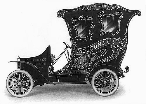 Möglicherweise gleichen Typs ist dieser als 12 PS (?) bezeichneter Reklamewagen aus 1906 im Stil einer barocken Prunkkarosse. Das Fahrzeug fuhr für den Frankfurter Parfümhersteller Mouson. Unübersehbar der „Torpedo“, die ansteigende Verdickung der Motorhaube vor der Windschutzscheibe, die Wagen vor 1914 den letzten Schick verlieh.