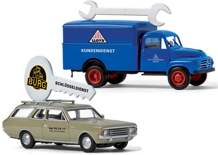 Dieses exklusive Set präsentiert erstmalig 2 Kundendienstfahrzeuge mit bedruckten Dachschildern. Der Borgward B 1500 ist für Lloyd und der Opel Record C ist für Burg Schlüsseldienst unterwegs.