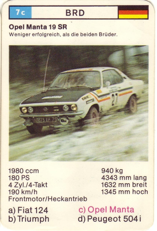 auf dem Flohmarkt habe ich ein altes Quartett mit Rallye-Fahrzeugen erstanden. Es sind folgende Opel dabei: