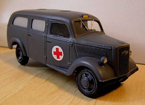 Von dem Kleinbus gingen Anfang 2003 bei eBay vier in diesem späten Wehrmachtsanstrich über den Tisch. Den letzten konnte ich ergattern. Der Krankenwagen kam dann aus den USA nach hier von pb-scalemodels.