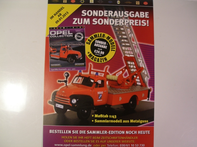 Das Heft enthällt eine Flyer, darin ab 9.1. 2013, der Opel Blitz 1952-1960 (Weichblitz) als Feuerwehrdrehleiter-Fahrzeug, was auffällt, der rechte Hautscheinwerfer vorn fehlt auf dem Bild :roll: