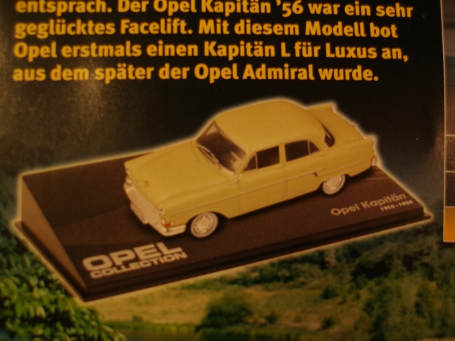 Im nächsten Heft, Opel Kapitän 1955-58 in gelb, chremfarben oder was weiß ich, damit sollten wir ja so langsam die gesamte Kapitänpalette komplett haben, gibts natürlich auch von Schuco für kleines Geld und ist um Welten besser was Details und die Verarbeitung angeht, dies kann schon im vorraus mit ruhigen Gewissen sagen, ohne das kommende Modell gesehen zu haben. Preis&Leistung hin oder her.
