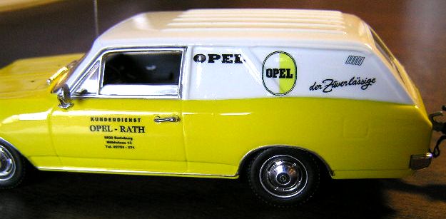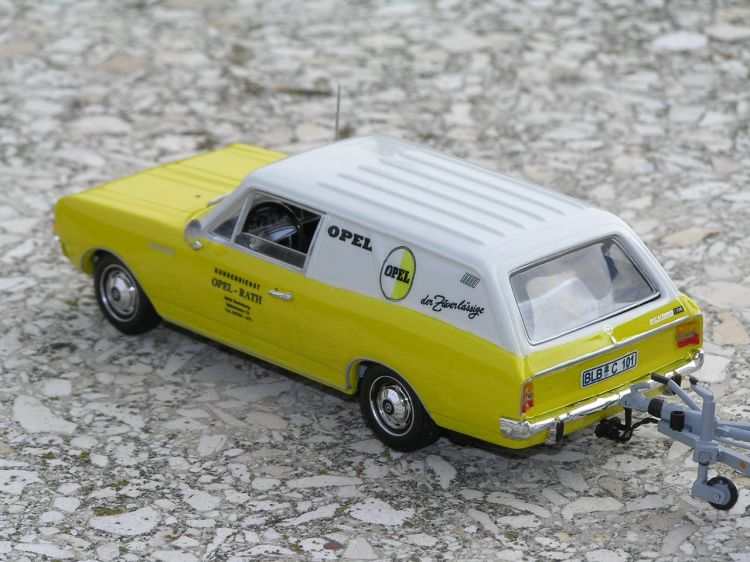 Und Uwe hat da ein ganz prachtvolles Modell gebaut! Genau so sah es zu Zeiten aus, das Mädchen für alles der Firma Opel-Rath in Berleburg, übrigens einem der ersten Opel-Vertragshändler überhaupt. „Zu Zeiten“, weil der Wagen dreimal selbst erhebliche Unfälle hatte, und anschließend - ein ideales Übungsstück - von den Rath-Stiften wieder aufgebaut wurde. So sah er um 1970 herum aus. Ursprünglich war er ganz weiß und später, glaub ich, graubeige lackiert.