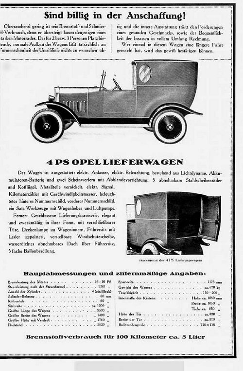 Offiziell wurde bei Opel im Jahr 1909 die Lkw-Produktion aufgenommen und 1910 die ersten leichten 1,5-Tonner ausgeliefert. Doch schon vorher gab es richtige Lkw-Aufbauten auf diversen Chassis. Vom vorstehenden 8/14 PS gibt es z.B. Bilder als Doppel-Phaeton und Landauer-Limousine, aber auch als Pritschenwagen und Milchkannen-Transporter!