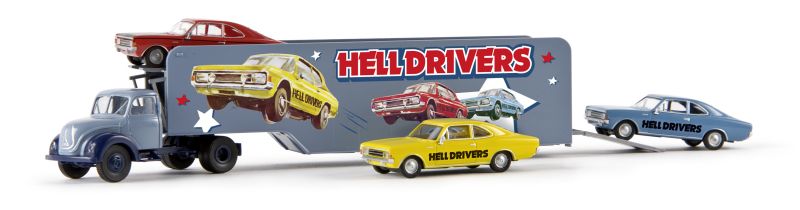 Das Set besteht aus einem Borgward-Autotransporter und drei Rekord C Coupés. :D