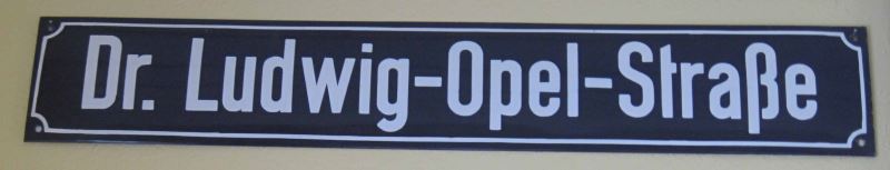 Ein Emailschild Opel Kapitän (wohl ein Replik). Ein Zeitstrahl Opel von 1862 bis 2011. Ein Straßenschild „Dr. Ludwig-Opel-Straße“, Email, weiß auf blau, original.