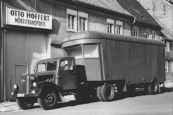 Wie oben bereits erwähnt, gab es Omnibus-Auflieger bereits in Kombination mit dem Blitz 2½-Tonner aus den Jahren 1934-1937. Zunächst aber ein Ausschnitt aus einem Prospekt des 2- / 2½-Tonners von 1935, in dem die Ausführung als Sattelzug bei den möglichen Aufbauvarianten gezeigt wird Der große Vorteil neben dem Gewinn an Ladevolumen war, dass sich die mögliche Nutzlast gegenüber einem Pritschenwagen praktisch verdoppelte. Hier eine Ausführung mit Kofferaufbau. Vor dem gleichen Hintergrund entstand das nächste Bild. Als Hersteller dieses (und des folgenden) Fahrzeugs wird wieder die Firma Schumann (Werdau / Sachsen) genannt. Das letzte Beispiel stammt dagegen mit größter Sicherheit von Kässbohrer. Der Ulmer Hersteller ließ seine Erzeugnisse traditionell vor dem Hauptportal des dortigen Münsters ablichten. TseHa