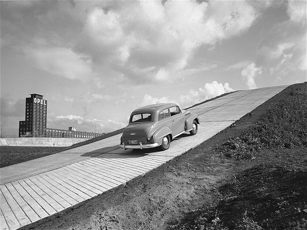 Hier erklimmt der neue Olympia Modell '51 gerade die Steilstrecke mit dem weithin zu sehenden Opel-Turm im Hintergrund.
