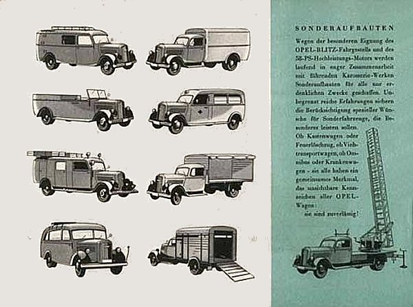 Nicht ganz so rosig wie bei den Pkw sah es bei den Nutzfahrzeugen aus. Richtig gut verkaufte sich der kleine Olympia Schnell-Lieferwagen, aber der Absatz des Blitz 1,5-Tonners bröckelte langsam, aber sicher, ab. Auch diese Konstruktion stammte wesentlich noch aus dem Jahr 1938, und manche Konkurrenten hatten mittlerweile neu entworfene Modelle auf dem Markt. Dennoch wurde der kleine Lkw noch mit hohem Aufwand gepflegt, wie die Seite mit einer Auswahl lieferbarer Sonderaufbauten aus dem genannten Prospekt belegt. Andererseits standen aber wohl etliche herum und warteten auf Käufer. Die Botschaft „kurzfristig lieferbar“ auf dieser Werbegrafik spricht für sich selbst!