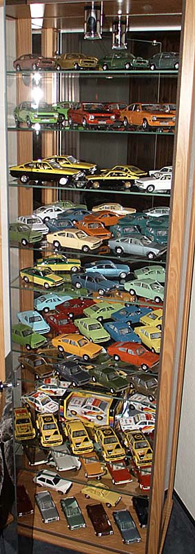 nö, die stehen alle in einer großen Vitrine; aber die ist jetzt auch bald voll. Hier mal ein Foto davon. Da stehen noch vier 1:18 und acht Chevrolet Chevette (ca. 1:25/ganz unten) drin. Na ja, eben alles was größer ist als 1:43. Die Kartons zu den Originalen stehen bis auf einen alle auf dem Dachboden; sehen ja auch nicht so toll aus in der Vitrine.
