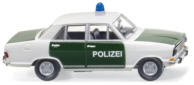 Karosserie in weiß, Chassis in schwarzgrau (RAL 7021); Inneneinrichtung schwarzgrau mit Lenkrad in schwarzgrau (RAL 7021). Scheinwerfer vorn transparent, Rücklichter hinten rottransparent eingesetzt, Kühlergrill schwarz, Stoßstangen vorne und hinten sowie Felgen in silber. Warnlicht blautransparent dachmittig eingesetzt. Motor- und Kofferraumhaube sowie Türen in grün. Seitlicher Schriftzug „Polizei“ in weiß. &