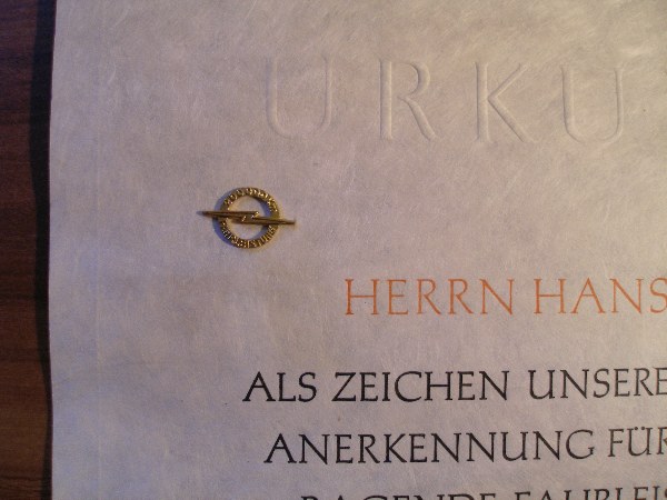 Ich habe es nun endlich mal geschafft wieder einen Teil meiner Sammlung zum Thema Opel zu erweitern, es handelt sich um eine Urkunde mit Nadel für die Kühlerplakette für 200000 km Laufleistung eines Opelwagens.