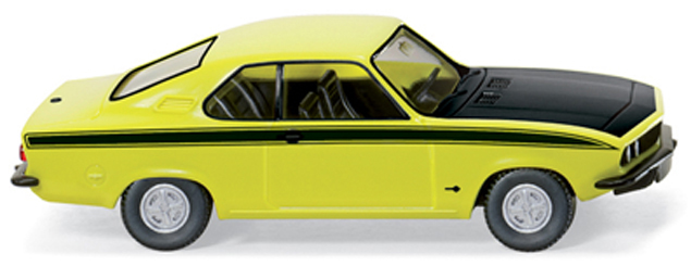 WIKING hat geschrieben: Karosserie in gelb, Fahrgestell in schwarz, Inneneinrichtung mit Armaturenbrett und Lenkrad in schwarz. Felgen in silber, Stoßstangen verchromt. Motorhaube flächig in schwarz bedruckt. Seitliche Fensterumrandung mit Türgriffen, Mantalogo und Dekorstreifen in schwarz. Frontseitige Fensterumrandung mit Scheibenwischern sowie Heckscheibenrand in schwarz. Opel-Logo auf dem Kühlergrill in silber. Heckklappe mit Opel-Logo in schwarz. Heckseitiges Kofferraumschloss sowie Nummernschildfläche sowie Einfassung in schwarz. Frontscheinwerfer handcoloriert in silber.