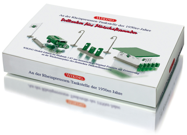 Das waren noch Zeiten, als „Rheinpreussen“ mit eigenem grünweißen Markenauftritt in der Welt der Tankstellen ARAL, Shell & Co. Paroli bot. Jetzt erinnert WIKING an die faszinierende Zeit, die auch für die prosperierenden Wirtschaftswunderjahre steht. Mit dem Klassiker-Set kommt WIKING vielen Markenenthusiasten entgegen, denn erstmals seit über 60 Jahren gibt es ein Wiedersehen mit dem legendären „Haus zur Tankstelle“. Nur kurzzeitig gebaut zählt es zu den begehrtesten Klassikern noch aus der Drahtachser-Ära. Aber auch darüber hinaus lässt WIKING viel Feingefühl bei der Zusammenstellung walten. Hinzu kommt natürlich die obligatorische Zapfsäuleneinheit, aber auch die Verkehrsinsel sowie die Markensteele. Desweiteren runden zwei Bogenleuchten, Ölfässer und der Opel Blitz-Tankwagen aus Kriegsbeständen das Sortiment ab.
