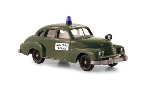 Karosserie in tannengrün, Inneneinrichtung in braun gehalten. Zwei blautransparente Stangenblaulichter im Dach eingesetzt. Kühlergrill in silber, Scheinwerfer per Handbemalung gesilbert. Seitliche Fensterzierleisten in silber. Vorn und hinten Schriftzug „Opel“ in silber, heckseitig Griff und Türschloss zusätzlich in silber. Kühlergrill vorn mit Schriftzug „Polizei“ in weiß. Heckseitiger Dachaufdruck „Polizei“ in weiß. Rückleuchten per Handbemalung in signalrot gestaltet. Felgen gesilbert. Lautsprecher in grün beifahrerseitig auf dem Kotflügel eingesetzt.